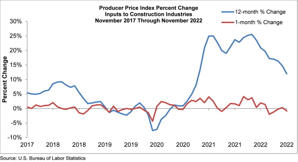 Construction input prices declined 0.9% in November compared to the previous month, according to an Associated Builders and Contractors analysis of U.S. Bureau of Labor Statistics Producer Price Index data released today. Nonresidential construction input prices fell 0.8% for the month.