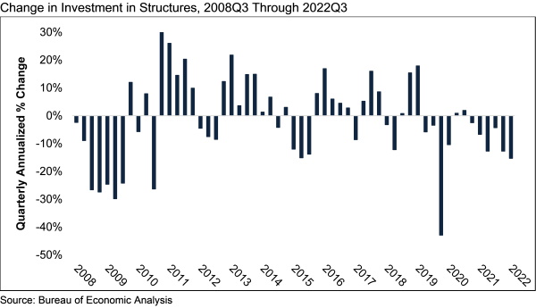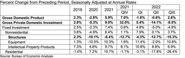 The U.S. economy expanded at a 2.6% annualized rate in the third quarter of 2022, according to an Associated Builders and Contractors analysis of data released today by the U.S. Bureau of Economic Analysis. Investment in nonresidential structures decreased at an annual rate of 15.3% for the quarter and has now contracted in 10 of the past 12 quarters.