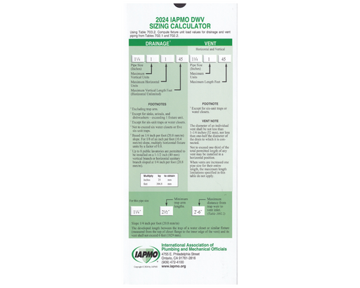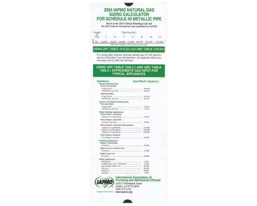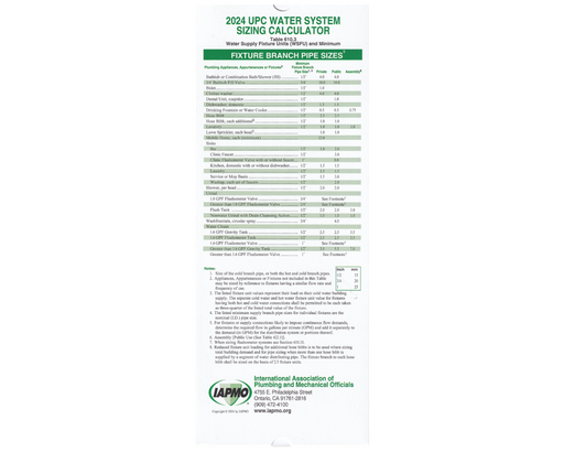 This Sizing Calculator is based on the 2024 Uniform Plumbing Code (UPC) and the 2024 Uniform Mechanical Code (UMC).