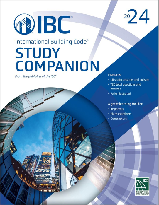 This Study Companion is a comprehensive self-study guide for the requirements of the 2024 International Building Code. It addresses occupancy classification, types of construction, fire protection systems, fire-resistance-rated construction, means of egress, and more.